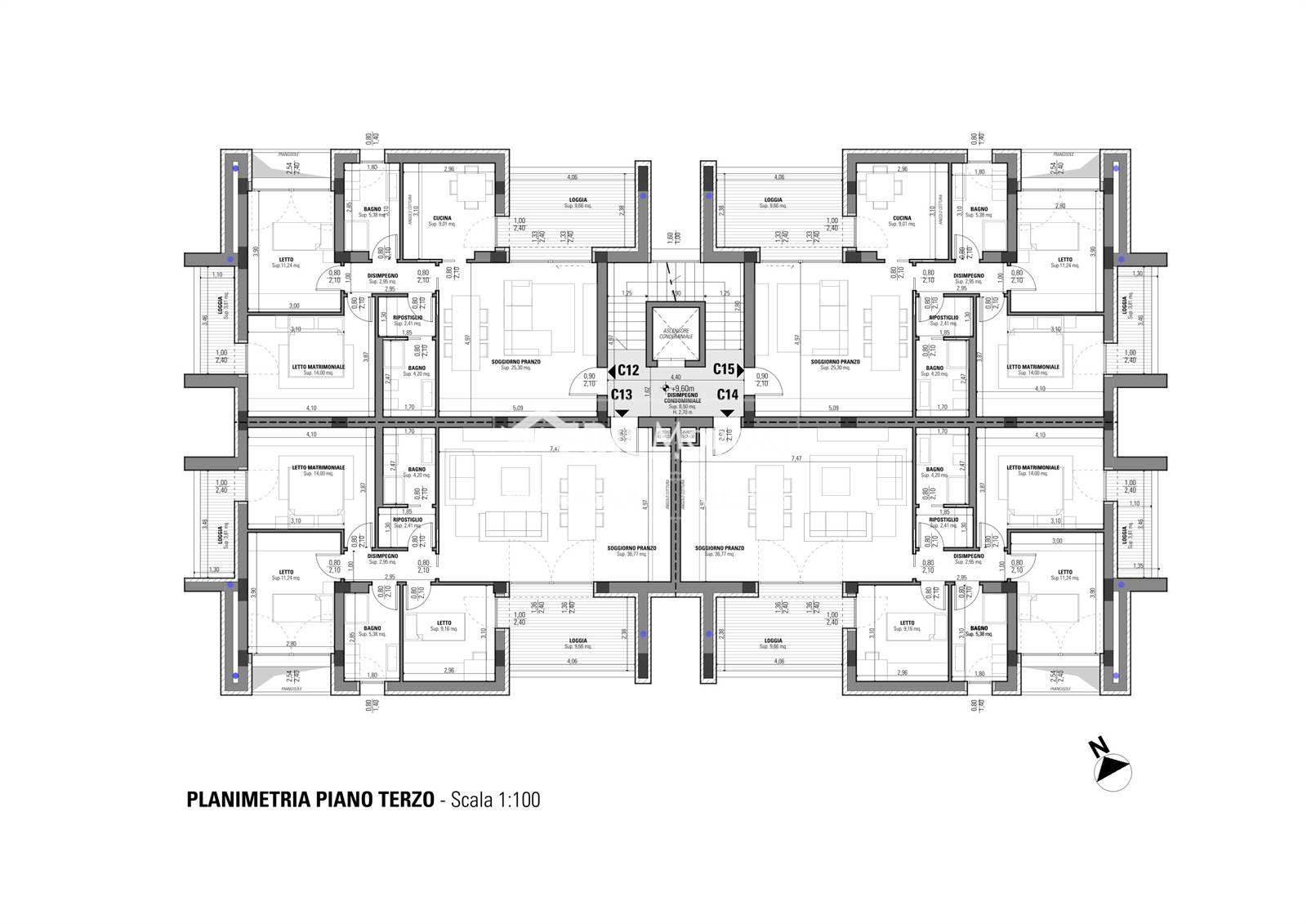 Appartamento così disposto: soggiorno/pranzo con cucina a vista, loggia, disimpegno, tre camere da letto (di cui una dotata di loggia), due bagni e ripostiglio.