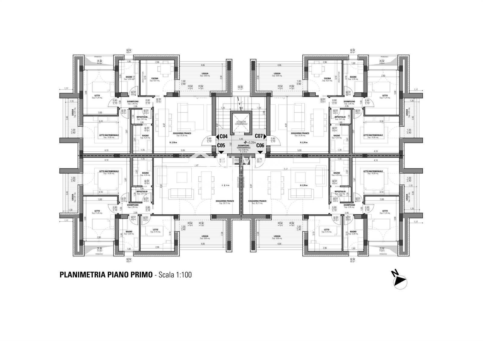 Appartamento così disposto: soggiorno/pranzo, loggia, cucina, disimpegno, due camere da letto (di cui una dotata di loggia), due bagni e ripostiglio.