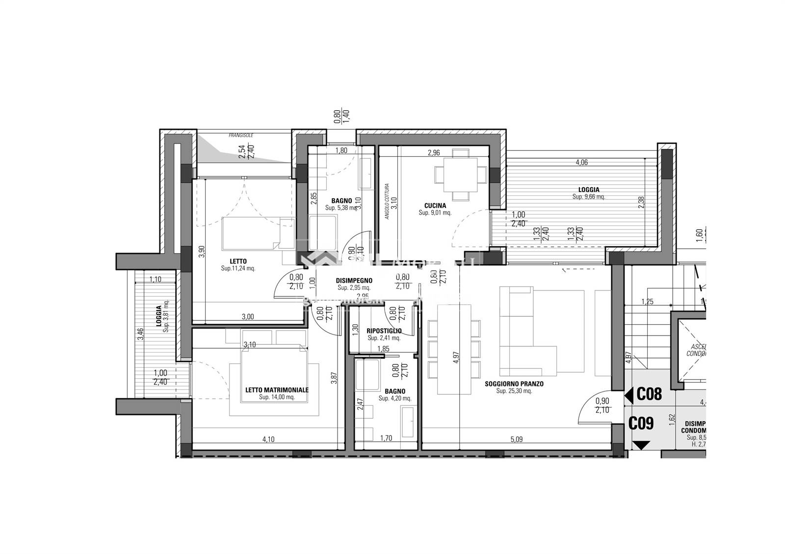 Appartamento così disposto: soggiorno/pranzo, loggia, cucina, disimpegno, due camere da letto (di cui una dotata di loggia), due bagni e ripostiglio.