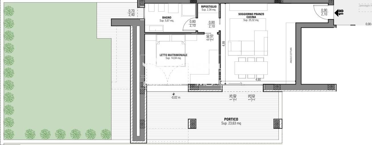 Appartamento così disposto: soggiorno/pranzo con cucina a vista, portico, giardino perimetrale, disimpegno, camera da letto, bagno e ripostiglio.