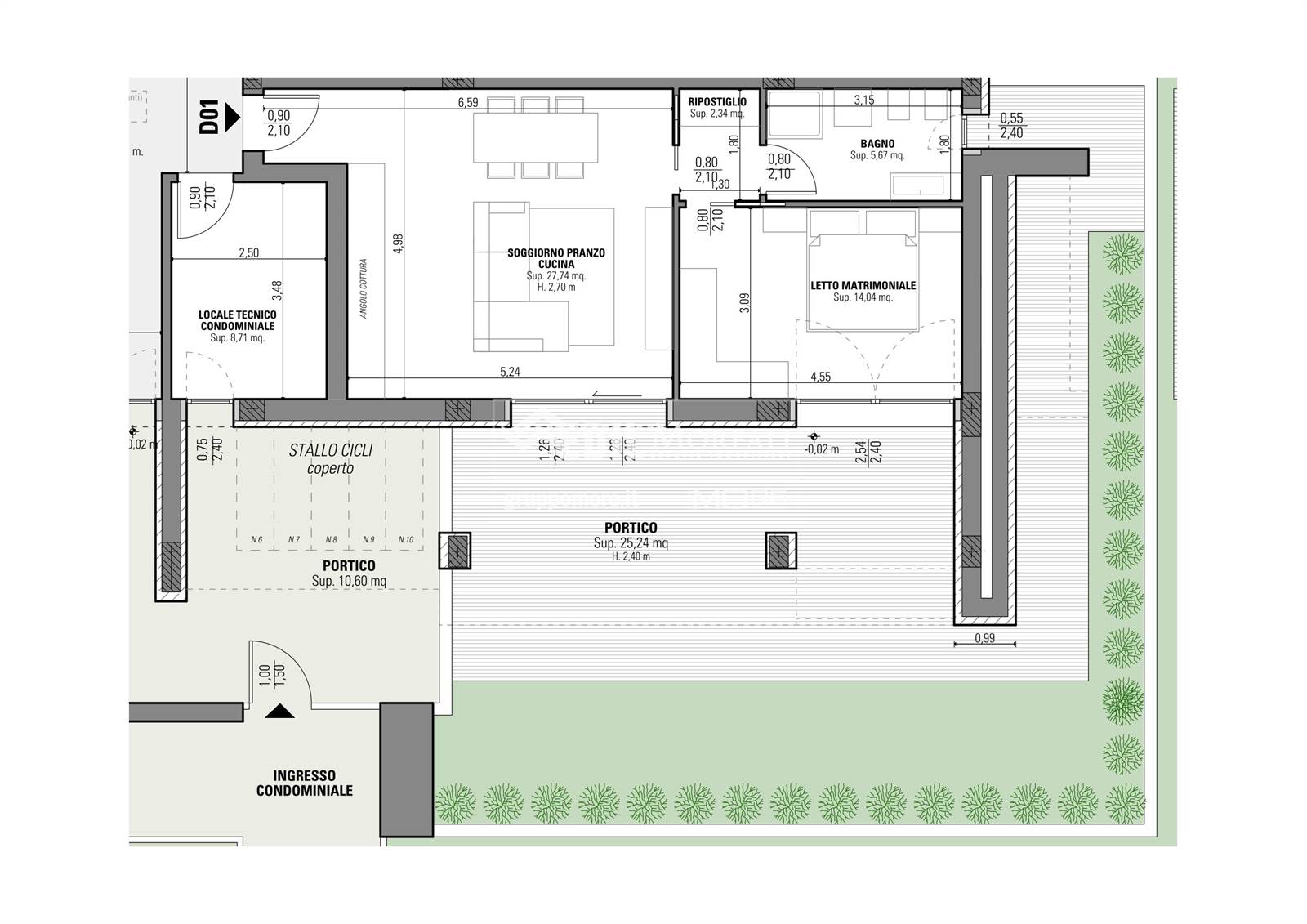 Appartamento così disposto: soggiorno/pranzo con cucina a vista, portico, giardino perimetrale, disimpegno, camera da letto, bagno e ripostiglio.