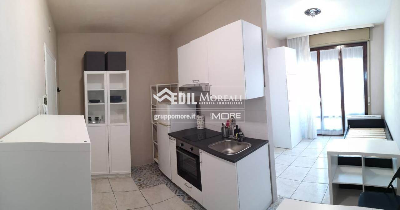 Ambiente unico ben distribuito con angolo cottura attrezzato, zona letto leggermente appartata, bagno finestrato con box doccia e balcone.