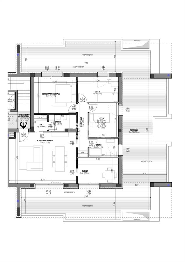 Appartamento così disposto: soggiorno/pranzo, cucina, disimpegno, tre camere da letto (con affaccio su terrazzo), due bagni, ripostiglio e ampio terrazzo perimetrale.