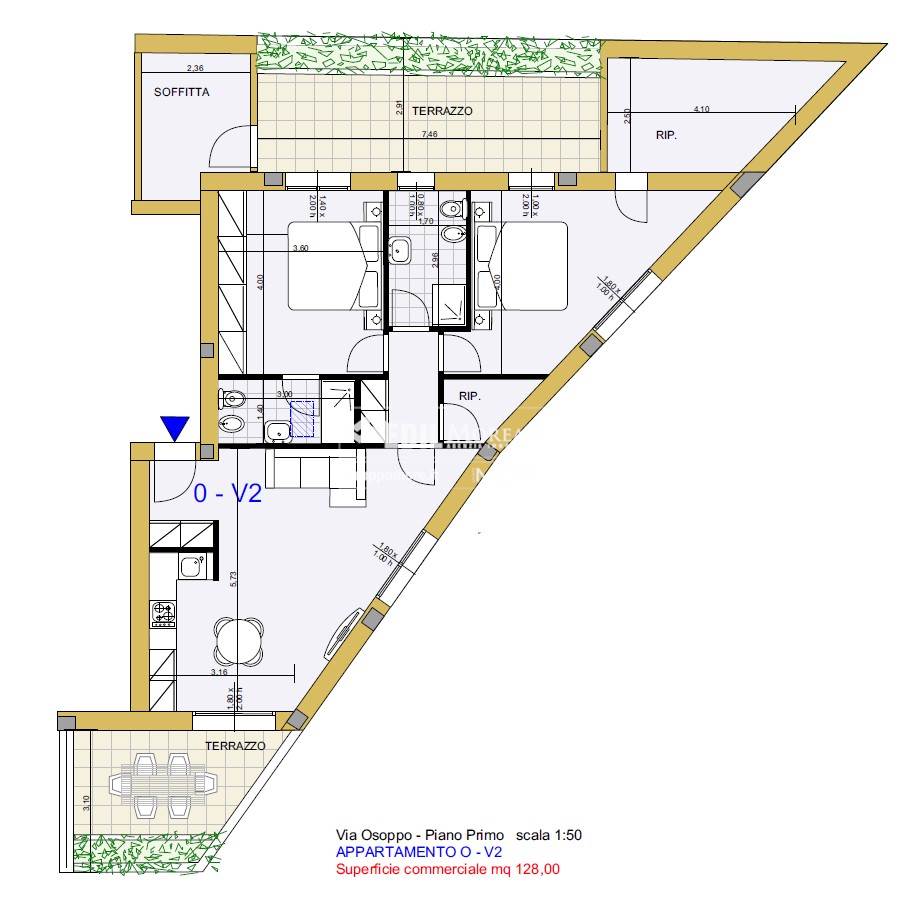 Immobile così disposto: ingresso, soggiorno con cucina a vista e sbocco su terrazzo, dis.,due bagni, due camere da letto matrimoniali con accesso al secondo e ampio terrazzo, due ripostigli/cabine armadi e un solaio.
