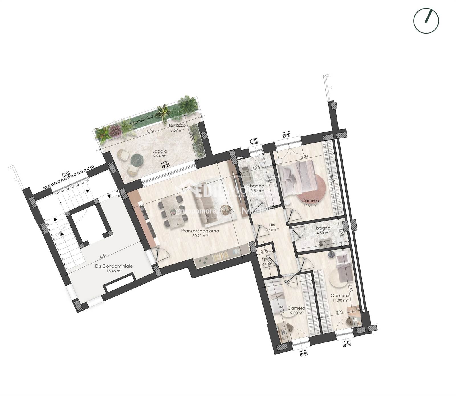 Appartamento così disposto: soggiorno/pranzo con cucina a vista, loggia coperta, giardino pensile, disimpegno, 3 camere da letto, due bagni (di cui uno cieco) e ripostiglio.