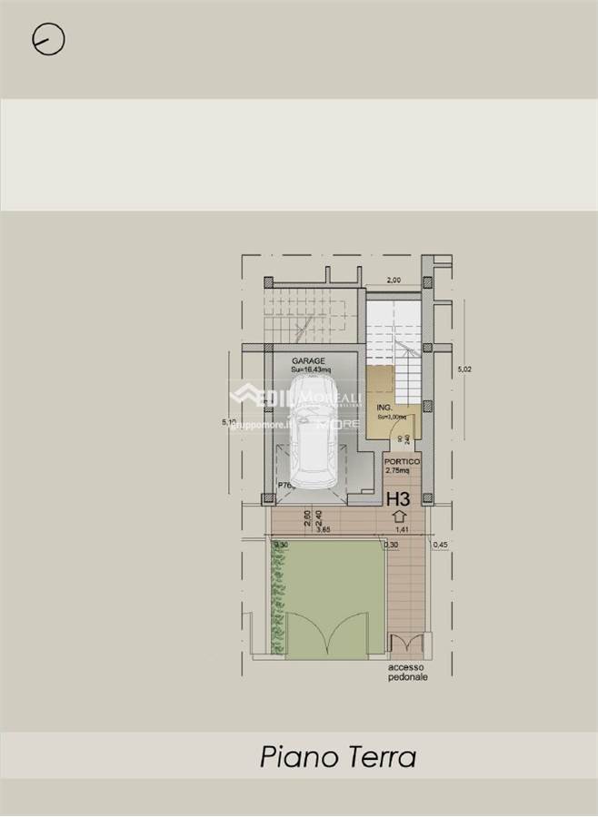 Immobile così disposto; PT: garage, giardino privato e ingresso P1°: soggiorno con angolo cottura, due camere da letto, due bagni e una cabina armadi..